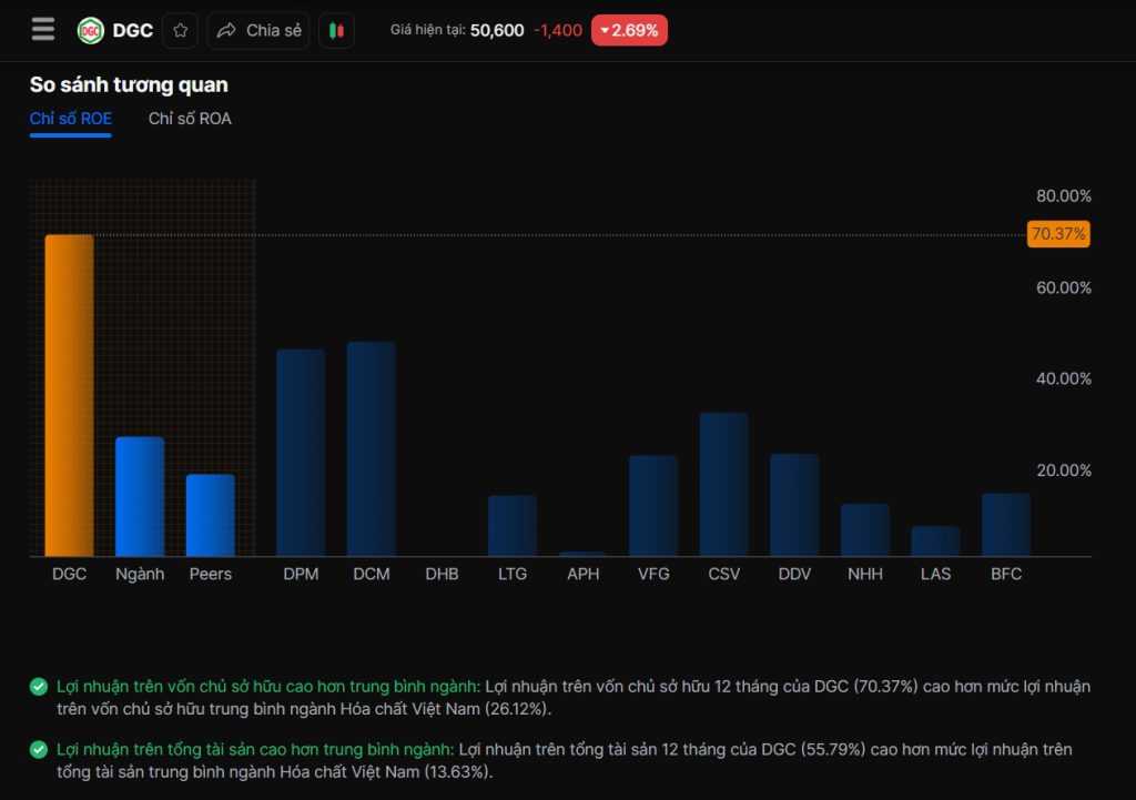 ROE của DGC thể hiện sự xuất sắc hơn so với các đối thủ trong ngành Hóa chất (Nguồn: Phân tích Hiệu quả hoạt động DGC – Simplize)