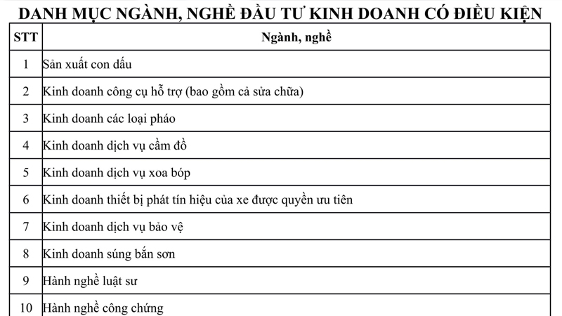 - Danh mục các ngành nghề kinh doanh có điều kiện quy định tại Phụ lục IV của Luật Đầu tư 2020. Ngành nghề kinh doanh có điều kiện nghĩa là cần tuân thủ những điều kiện cần thiết liên quan đến an ninh, quốc phòng, trật tự, an toàn, đạo đức xã hội, sức khỏe cộng đồng.