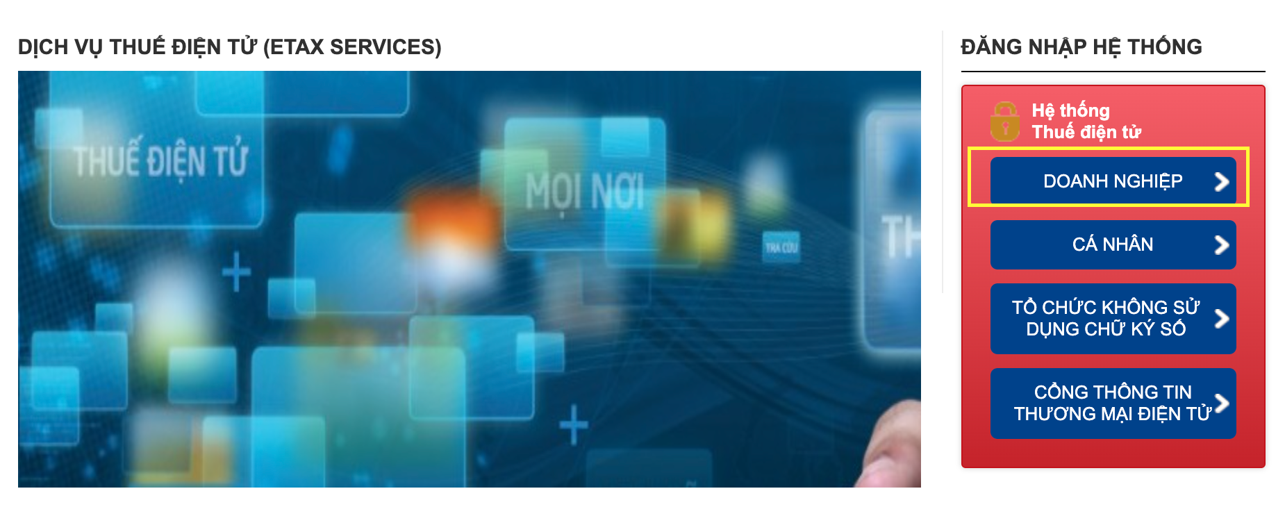 Sau đó bạn nhấn chọn Doanh nghiệp và chọn Đăng nhập (góc phải trên cùng)