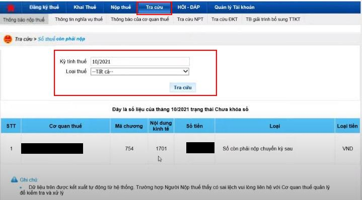 Chọn Tra cứu sau đó chọn Số thuế còn phải nộp.