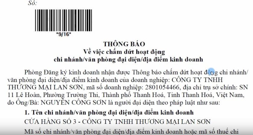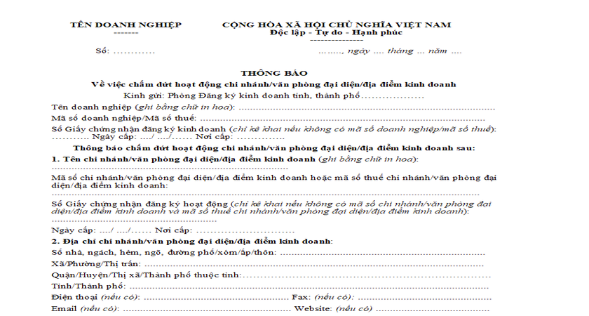 Đồng thời, phòng đăng ký kinh doanh cũng phát thông báo về quá trình chấm dứt hoạt động của văn phòng đại diện.
