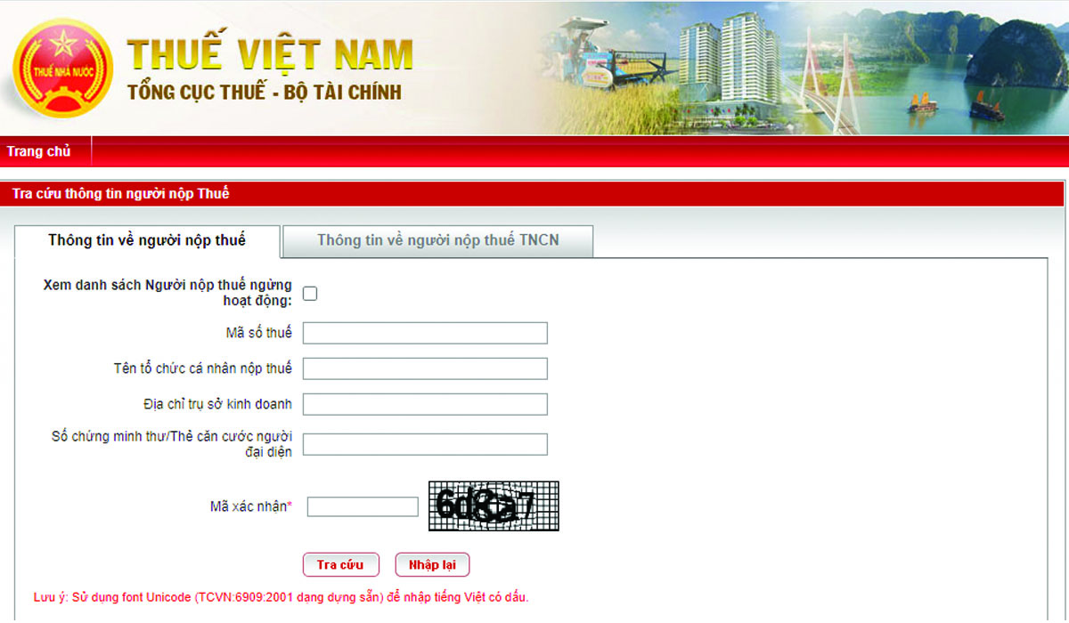 Khách hàng cần nhập một trong các thông tin sau: Mã số thuế, Họ và tên, Địa chỉ hoặc Số chứng minh thư/Thẻ căn cước. Sau đó, người dùng cần nhập đúng mã xác nhận và nhấn nút “Tra cứu” để thực hiện tra cứu thông tin.
